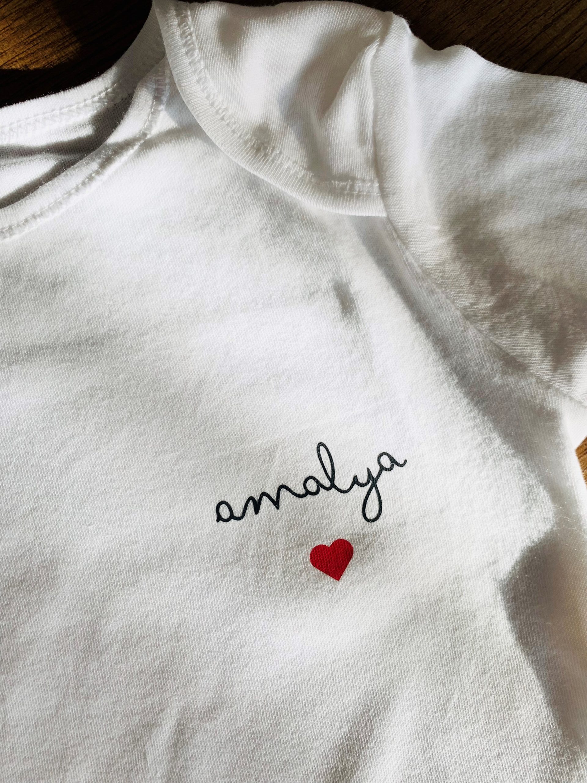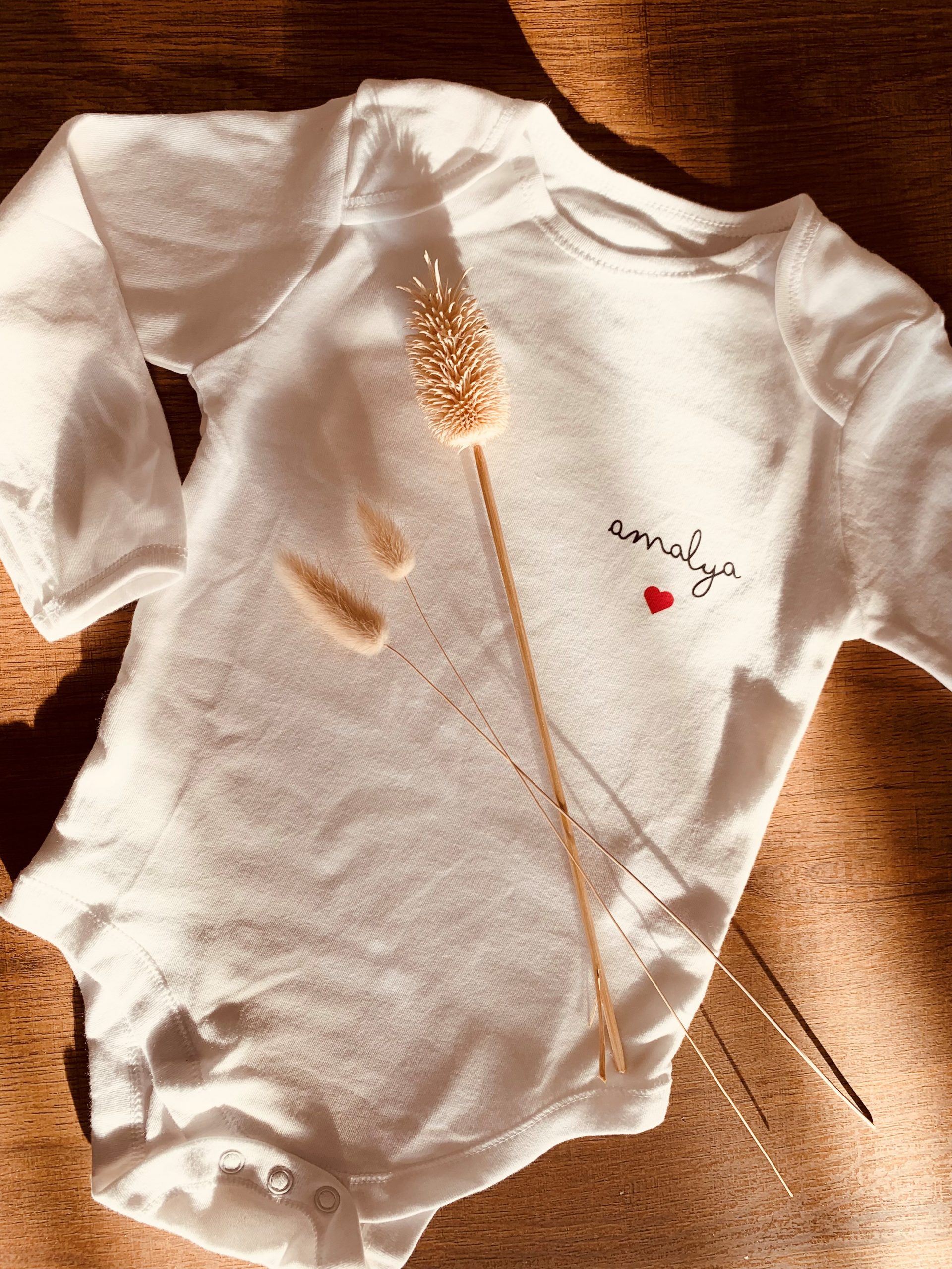 Cadeau unique pour une naissance, un moiniversaire, une annonce de grossesse…  Laissez place à votre imagination afin de personnaliser le body de bébé avec son prénom, surnom, sa date ou son heure de naissance.