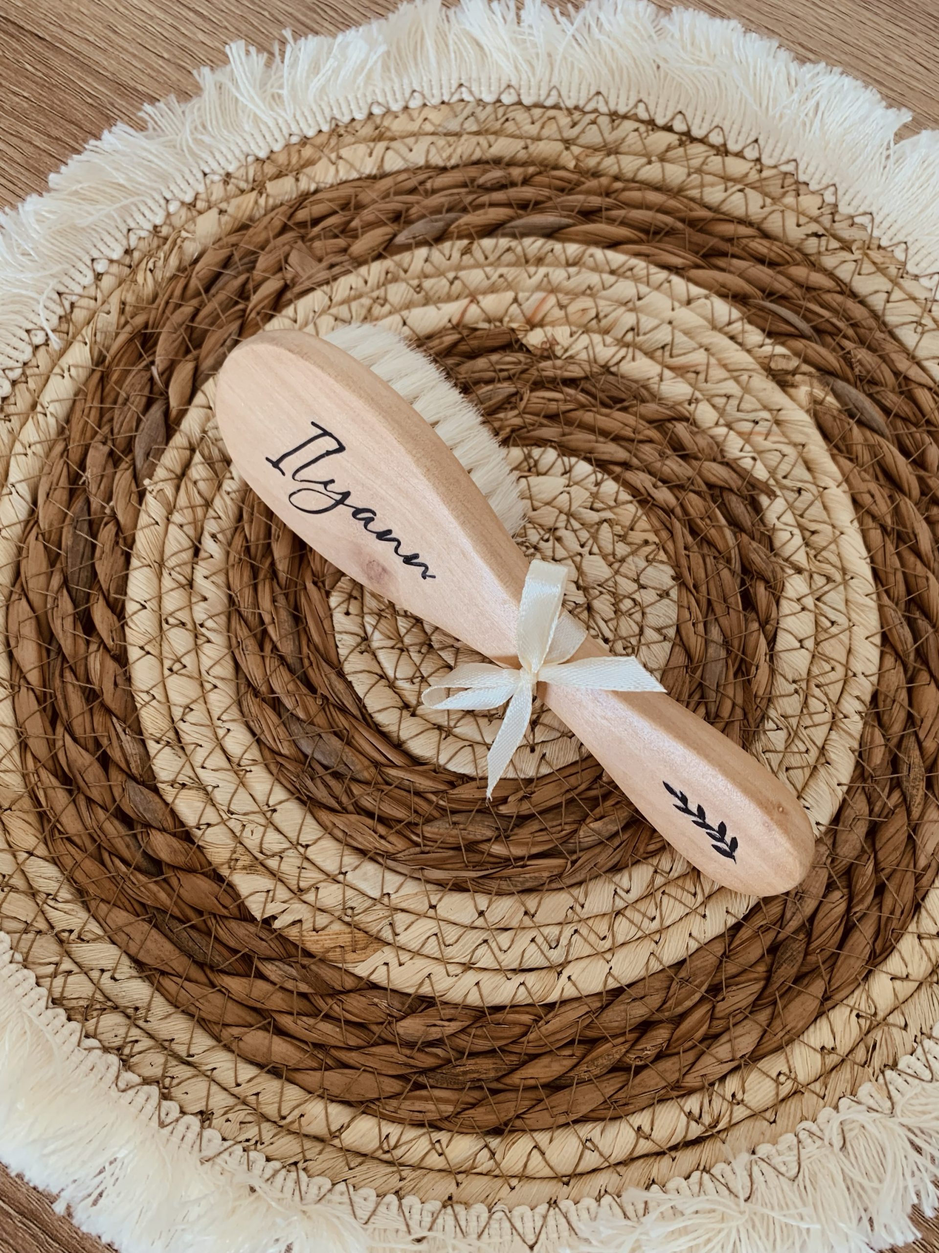 Cadeau unique pour une naissance, un moiniversaire, une annonce de grossesse… Laissez place à votre imagination afin de personnaliser la brosse de bébé avec son prénom, surnom, sa date ou son heure de naissance.